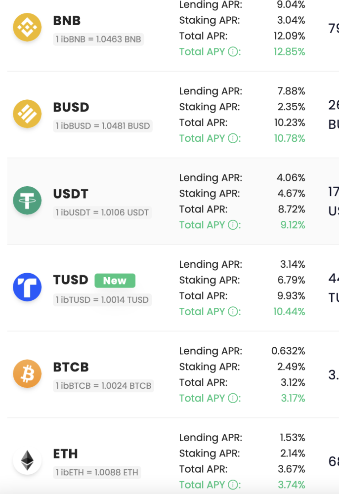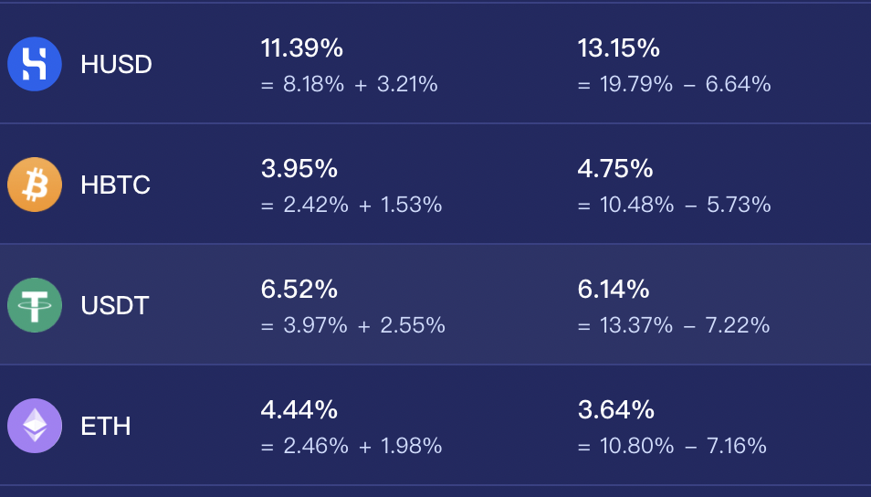 然后再出来的机枪池和杠杆机枪池把策略提供出来甚至加上杠杆,提高了资金使用效率,从杠杆产品的借贷上来看,资金使用率更高了,对比借贷产品借款利息也更高;下图为bsc/heco链上杠杆机枪池和借贷: