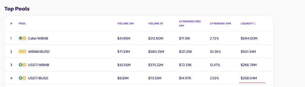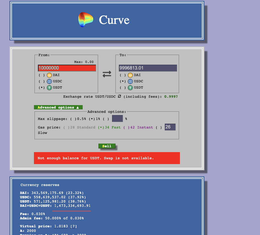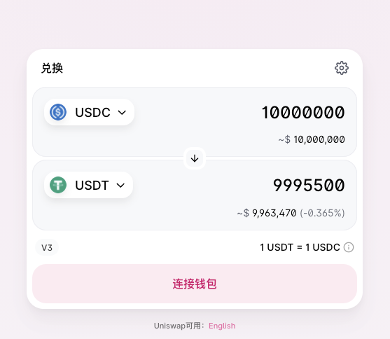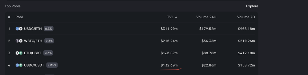 随着Uniswap V3 的诞生,Swap上资金更高效的利用方式也出现了,在原有的AMM模型上,所有LP的挂单都是在价格趋近于0~∞之间来进行挂单,大部分挂单并没有实际意义,在绝大多数情况下,大部分的资金并不提供任何实际交易;如下图所示,以USDT/USDC交易对为列,其中Uniswap V3所提供的TVL为1.3亿usdt,curve提供的TVl为14.7亿usd,Pancake为2.6亿usd;交易1000万usd的交易摩擦分别为4500usd;3200usd;745000usd。