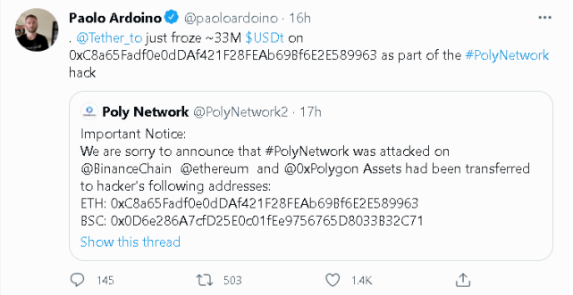 官方呼吁受影响链上的矿工与各大交易所阻止来自黑客地址的代币交易。并表示将采取法律行动,同时敦促黑客归还资产。随后,Tether CTO Paolo Ardoino表示,已冻结PolyNetwork盗币案中3300万美金的USDT。