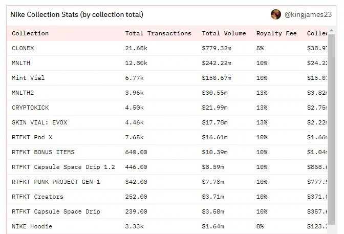 依据根据Dune归纳的公共性区块链数据信息,目前为止,耐克的重要NFT销售额为9300万美金,此外还有使用价值9200万美元的NFT买卖稿酬。