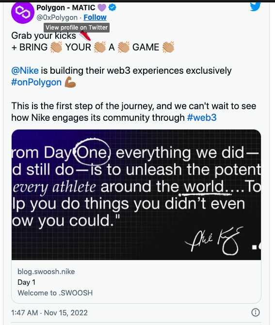 11月14日,耐克公布推出Web3平台生态体系.SWOOSH,除此之外Polygon NFT也将在2023年推出。