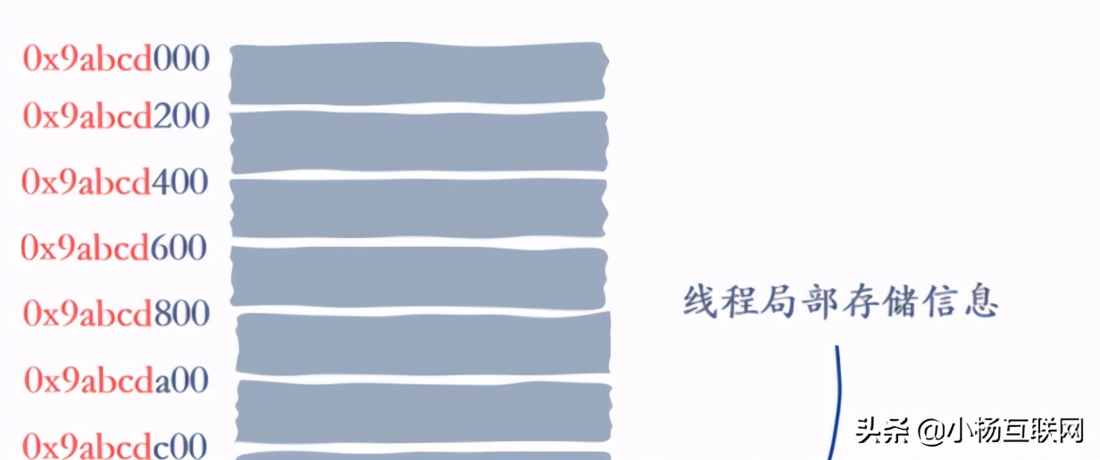 这样拿到任意一个内存的地址我们就能知道对应的大段内存的起始地址,只需要简单的将后12个bit置为0即可,有了大段内存的起始地址剩下的就简单了,我们可以在大段内存中的最后保存对应的线程局部存储信息: