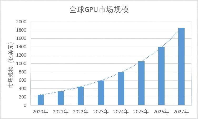 作为图形渲染和智能计算的主要平台,GPU产业已形成较大规模。据Verified Market Research数据统计,2020年全球GPU市场价值为254.1亿美元,2027年有望达到1853.1亿美元,年平均增速高达32.82%。