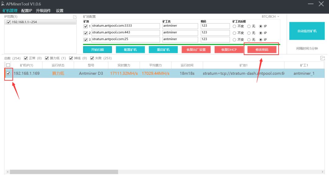 1)用蚂蚁软件(APMinerTool V1.0.7)先搜索矿机,选中要批量修改的矿机,然后点击“修改密码”。
