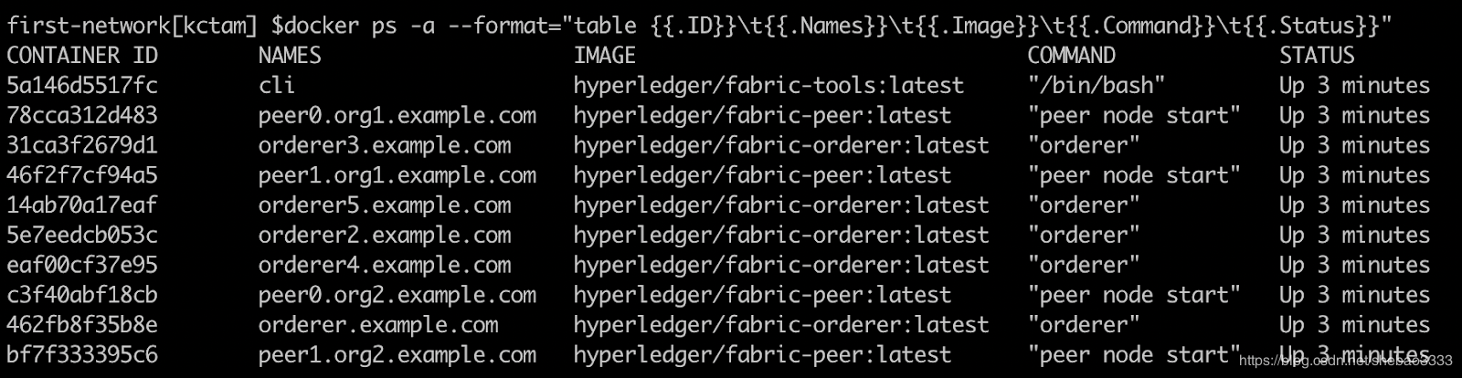 下面时基于raft排序的BYFN网络启动后的情况,你可以看到有5个orderer在运行: