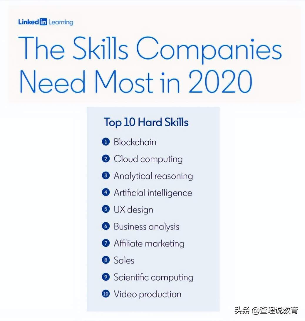 根据领英教育220年的调查,企业最需要的10种技术人才中(如下图),区块链技术排第一,其后是云计算,分析推理,人工智能,用户体验设计,商业分析,联盟营销,销售,科学计算和视频制作。