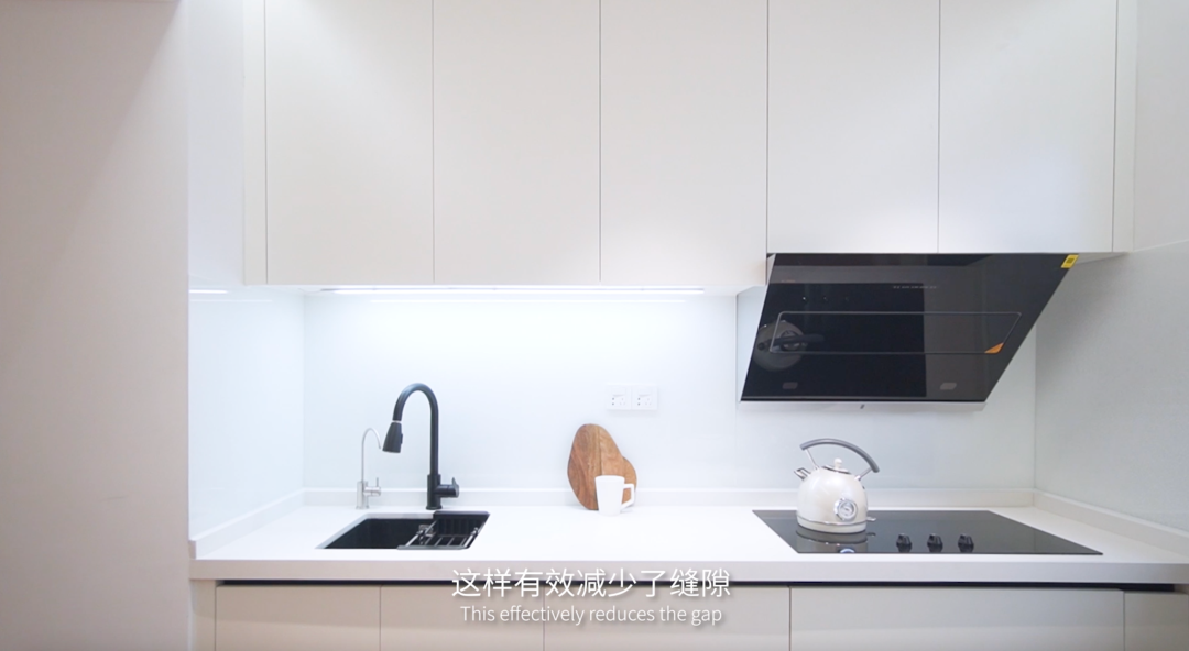 电陶炉+嵌入式洗碗机,还有吸油烟机,再搭配手扫式的感应灯带,提升了厨房空间的照明条件。