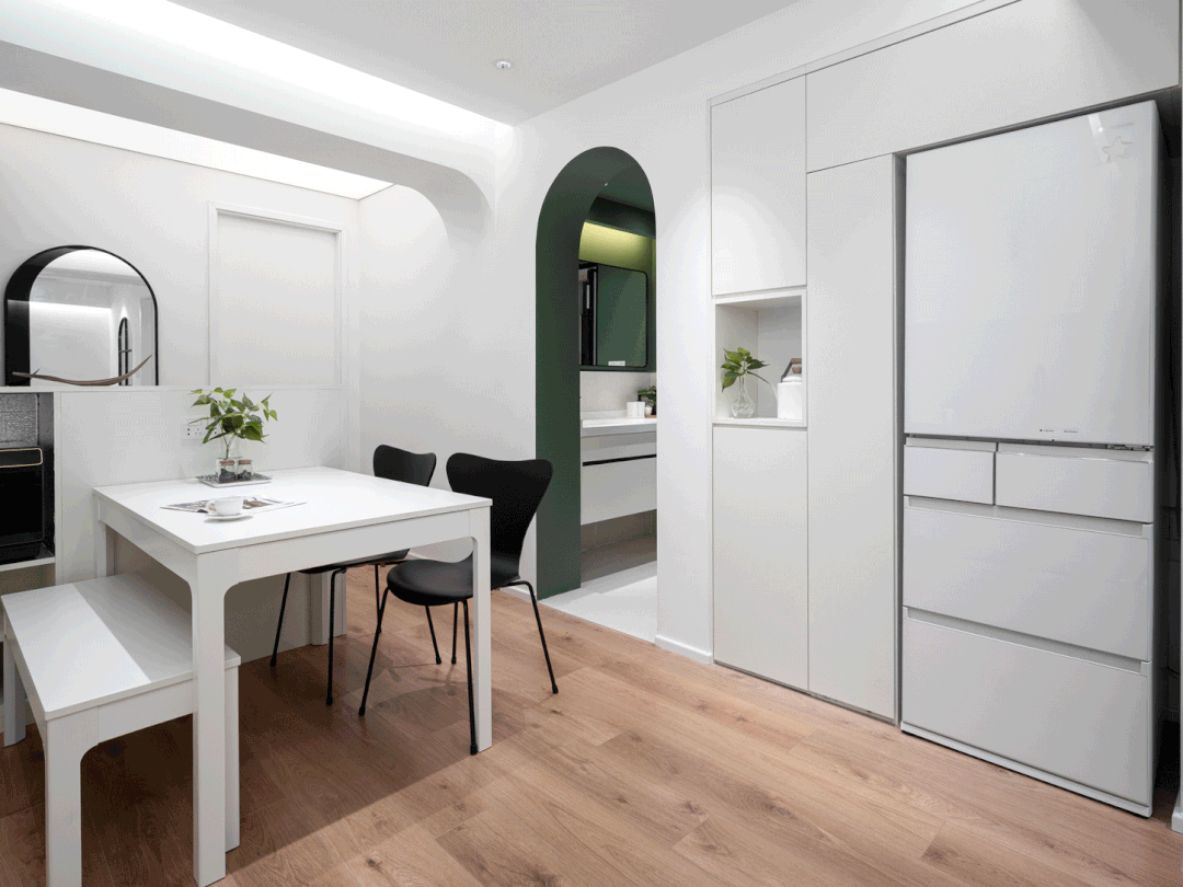 而公共空间,则被调整到了光线较差的一面。入户玄关与餐厨区相连,并且以一组双面使用的矮柜进行隔断。