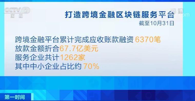 截至10月31日,跨境金融平台累计完成应收账款融资6370笔,放款金额折合67.7亿美元,服务企业共计1262家,其中中小企业占比约70%。