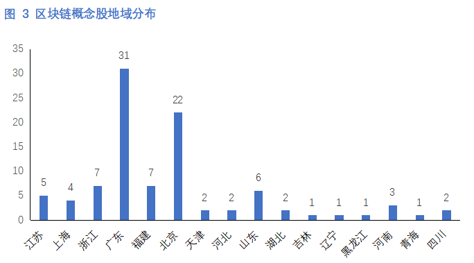 从市值分布上看,目前大多数区块链概念股的市值均在100亿元人民币以下,占样本总数的73.2%,而仅有3家市值在1000亿元人民币以上,分别是顺丰控股,三六零和用友网络;从地域分布上看,目前广东和北京两地的企业数量最多,其中广东共31家上市公司涉及区块链相关业务,而北京有22家上市公司。