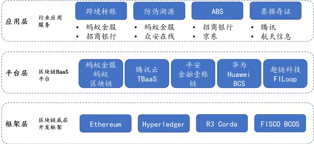 如领导人讲话指出,区块链技术已经不仅局限于加密资产行业,其在金融科技的前沿创新领域,诸如清结算、支付、电子发票、供应链金融、贸易融资等,均开始发挥积极的作用。目前,主要的区块链开源架构有比特币、以太坊、Hyperledger Fabric、R3 Corda 等,中国国内则有蚂蚁金服、平安、腾讯、万向等主要的区块链平台服务提供商。