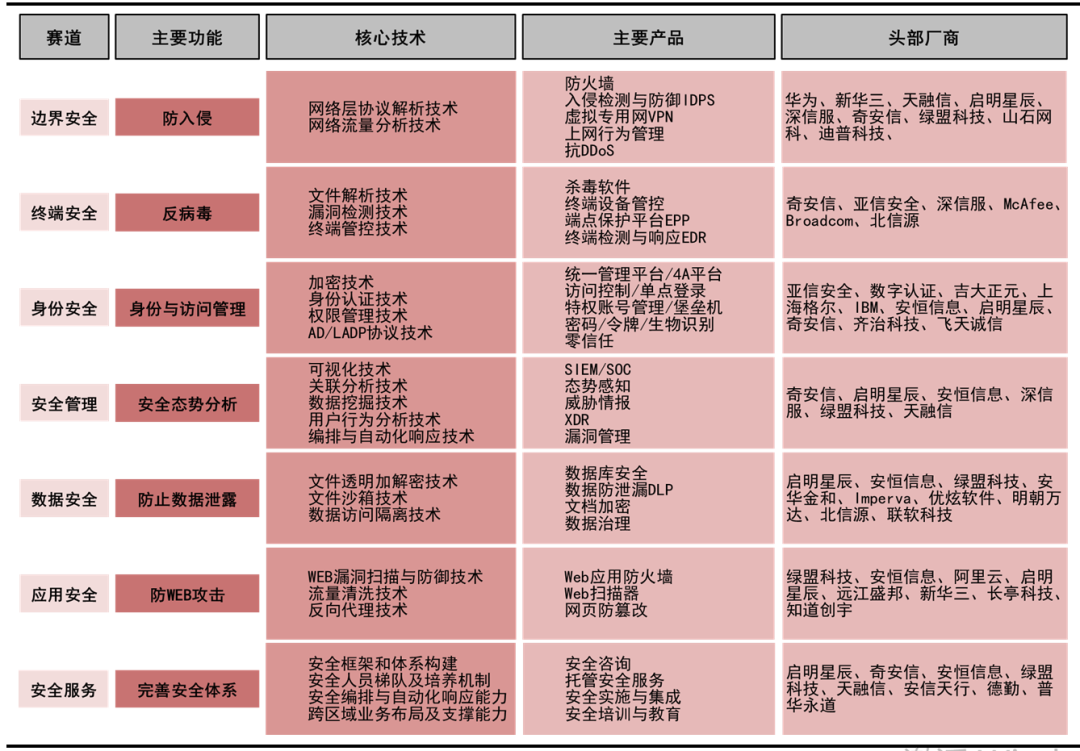 如何对安全赛道进行有效划分?我们认为应该基于底层技术协同和应用场景协同,即将解决同类问题,应用同类场景的产品纳入到一个统一的视角。而且从一个安全公司的成长路径来看,基本上都是从单一产品出发,然后复用底层技术来扩张产品线,最后再进行跨赛道跨领域的横向扩张,这样的划分方式也符合网络安全厂商的发展规律。因此我们从技术栈和安全域的视角出发,将网络安全行业分为网络边界安全、终端安全、身份安全、安全管理、数据安全、应用安全及安全服务7大方向,其中: