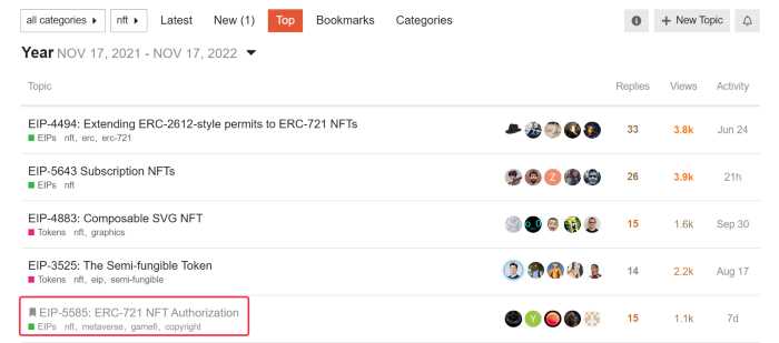 鉴叔近期注意到在2022年度小区提案的260好几个活跃性提案中,EIP-5585被探讨的人气非常高,现阶段综合排行第13 名,NFT本年度提案排第5名,而且关注度还在持续升高,那么我们就以EIP-5585来说吧,分享一下大家日常能够怎么关注EIP的高速发展,如何更好地进一步参加协议的解读讨论。