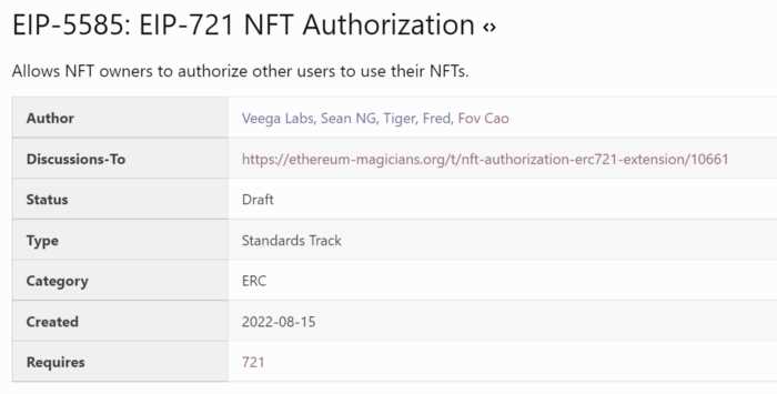 例如EIP-5585就是属于ERC这一归类,换句话说,如果这些协议最后真正根据小区审查,进到Final情况,那样将成为ERC-5585规范协议,那样全部项目方和生态建筑者就可以用这一协议去拓展自已的应用领域了。