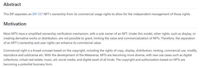 从他的引言(Abstract)和动因(Motivation)一部分能够看见,他想要克服的关键问题是把NFT(ERC-721)的使用权与商业所有权开展分离出来,进而容许NFT持有者去单独管理方法这种权利,更大化NFT的经济收益。