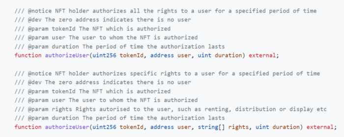 这俩插口区别关键是一个能把NFT的所有权利受权给指定客户(user),另一个是将指定权利(string[] rights)受权给消费者。这里有一个关键性的主要参数是rights。