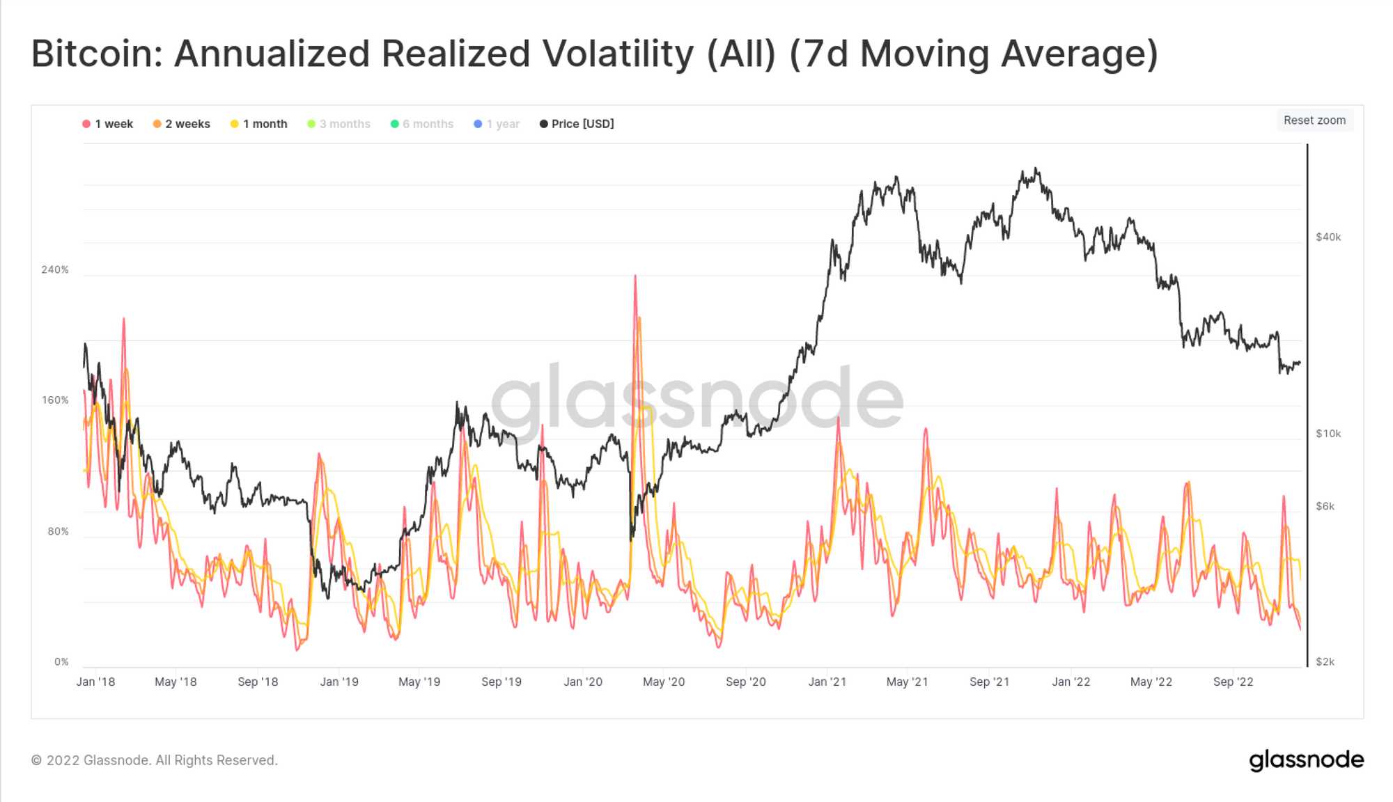 在经历真真正正杂乱的一年后,比特币销售市场进入到12月后变得十分宁静。比特币的短期内完成波动率目前正处多年的低点,为(1周)22%和(2周)28%,是2020年10月至今最低波动率。