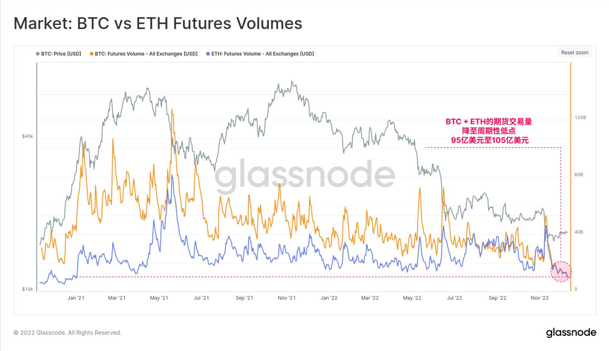 期货交易交易量也是一样不景气,现在正在探索多年的低点。比特币和以太坊销售市场现阶段的交易量都是在每日95亿美金到105亿美元中间,交易量相差无异。这显示流通性缩紧的很大影响,广泛脱虚向实,及其这一领域的诸多贷款和交易中心的不良影响。