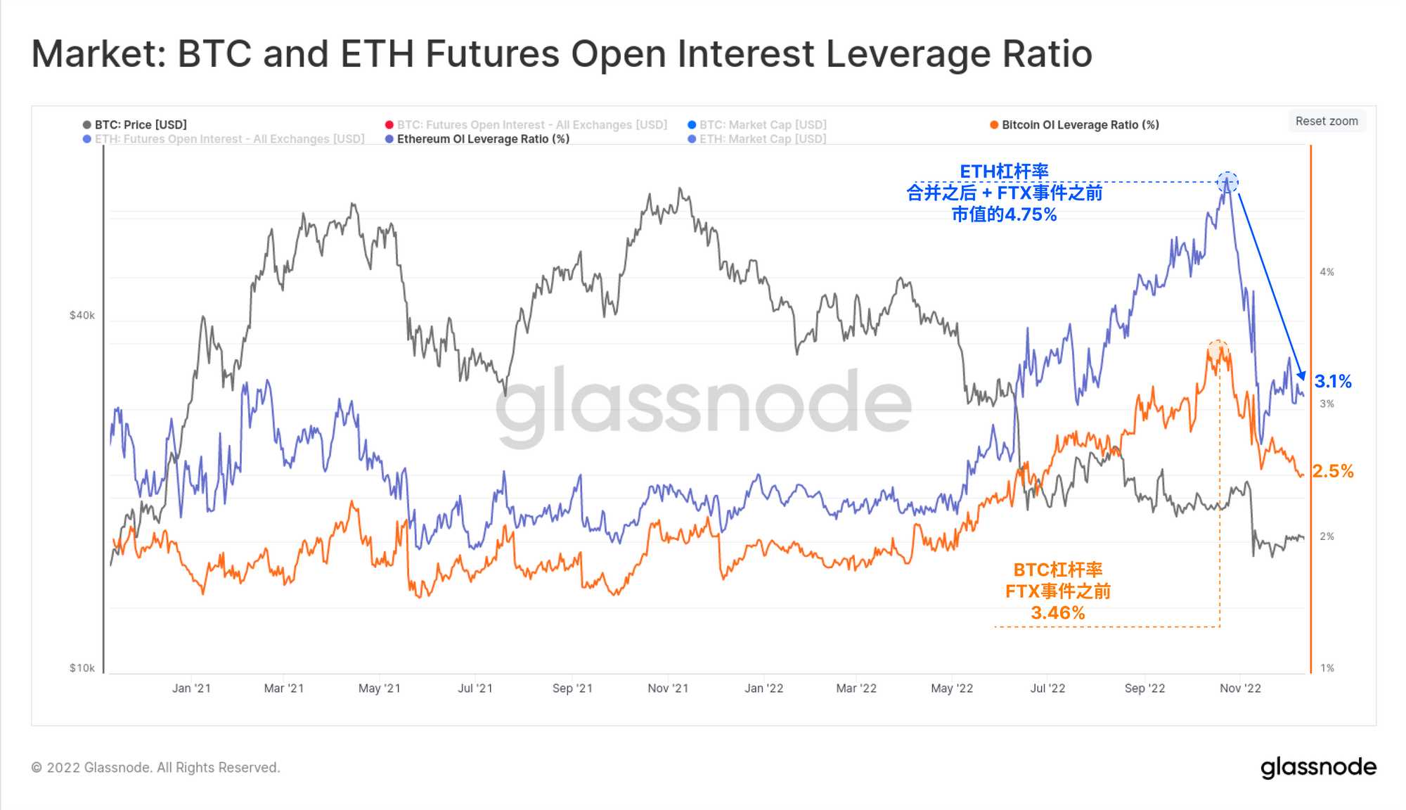 在FTX内爆以后,期货交易市场的未平仓合同早已大幅度减仓。下面的图显示杠杆比率,测算为期货交易未平仓合同与相对应财产总市值中间的比例。
