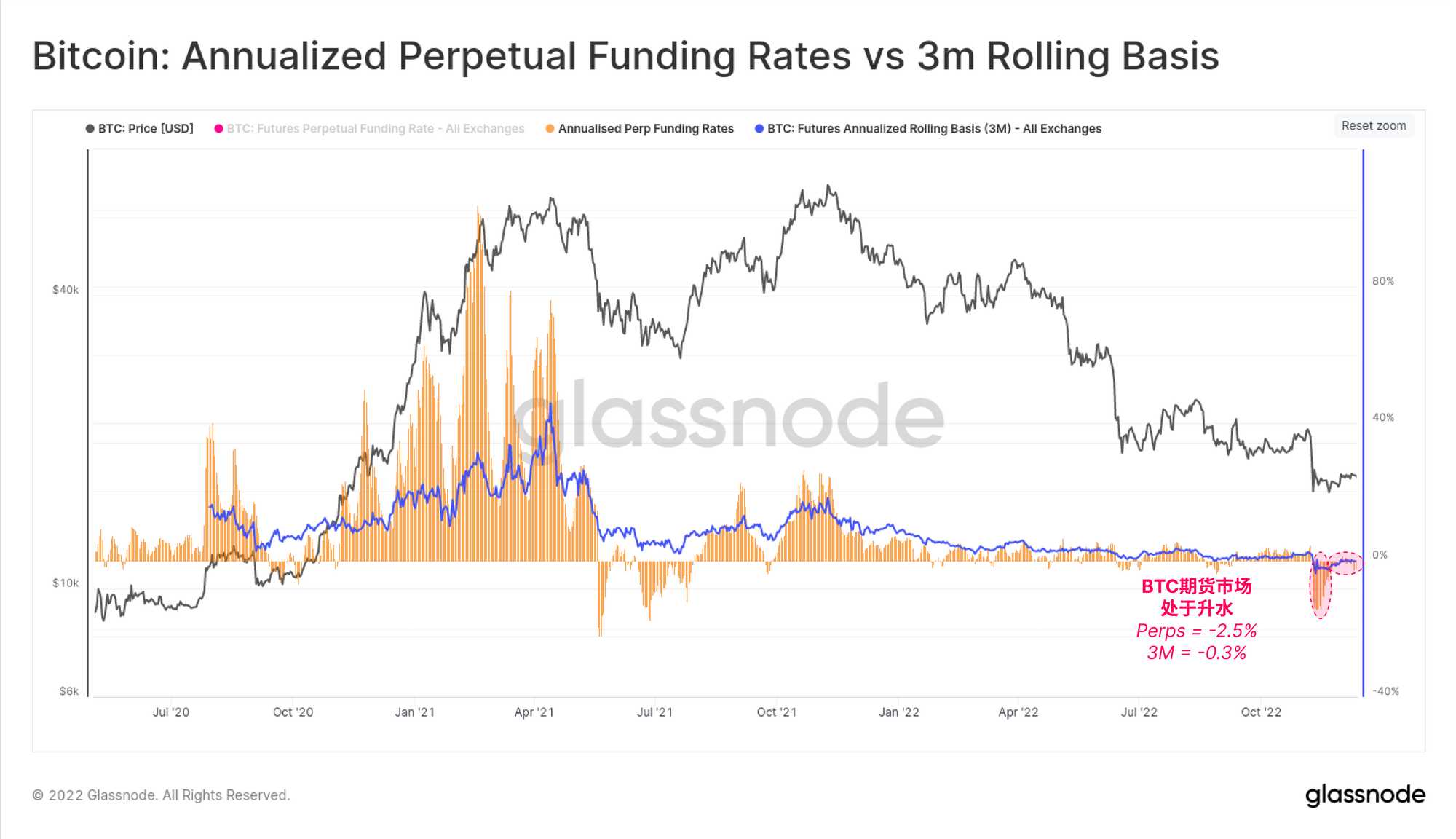 比特币日历期货交易和永久性掉期交易买卖交易都处在期货升水情况,年化利率基本分别是-0.3%和-2.5%。持续不断的期货升水并很少见,唯一相似的阶段是2021年5月至7月间的横盘整理期。这说明销售市场相对性 "对冲交易 "了进一步的下行压力,或出现了更多空单投机商。