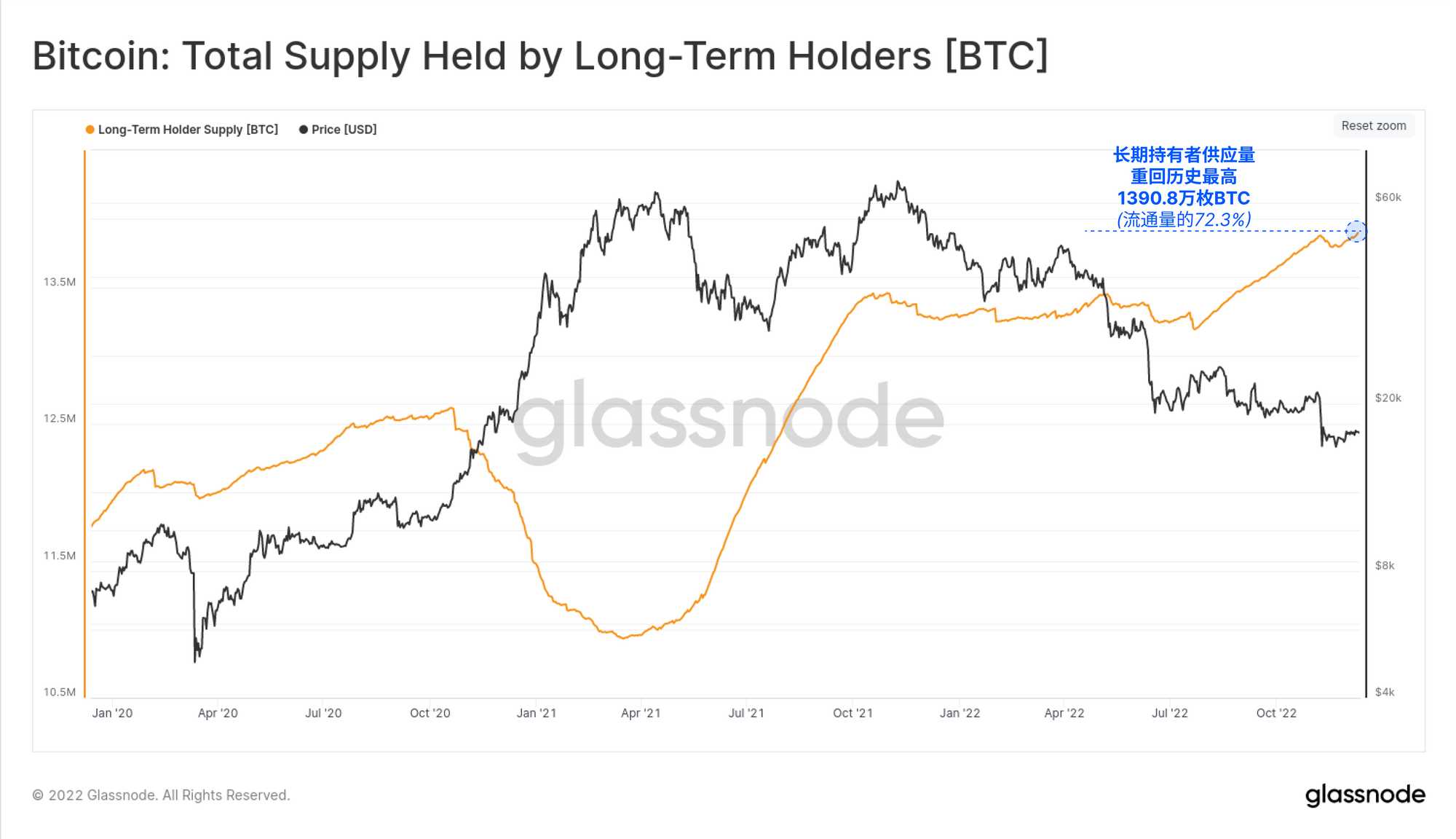 尽管有这种令人惊讶的重大损失,比特币供给的年纪,以及一些留下来的人的囤币的趋向再次升高。自FTX事情后急跌售出以后,长期性持有人的供给早已彻底恢复了,达到1390.8万枚比特币的创历史新高(占商品流通供给的72.3%)。