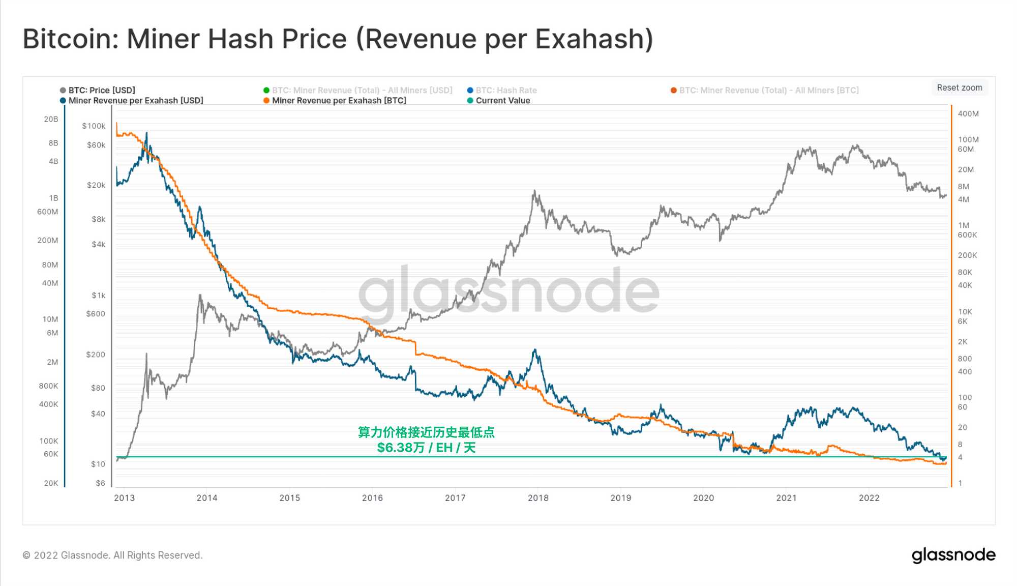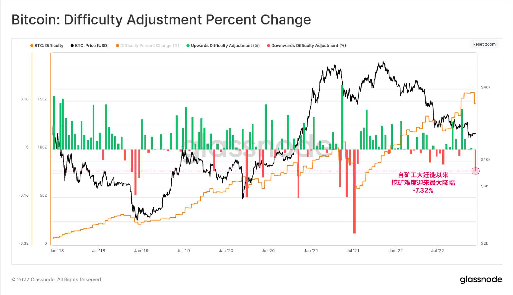 上星期出现自2021年7月开采大迁至今最大的一个难度系数下降。难度系数下降7.32%,代表着非常大一部分有活力的算率退出,这应该是持续收入压力结论。