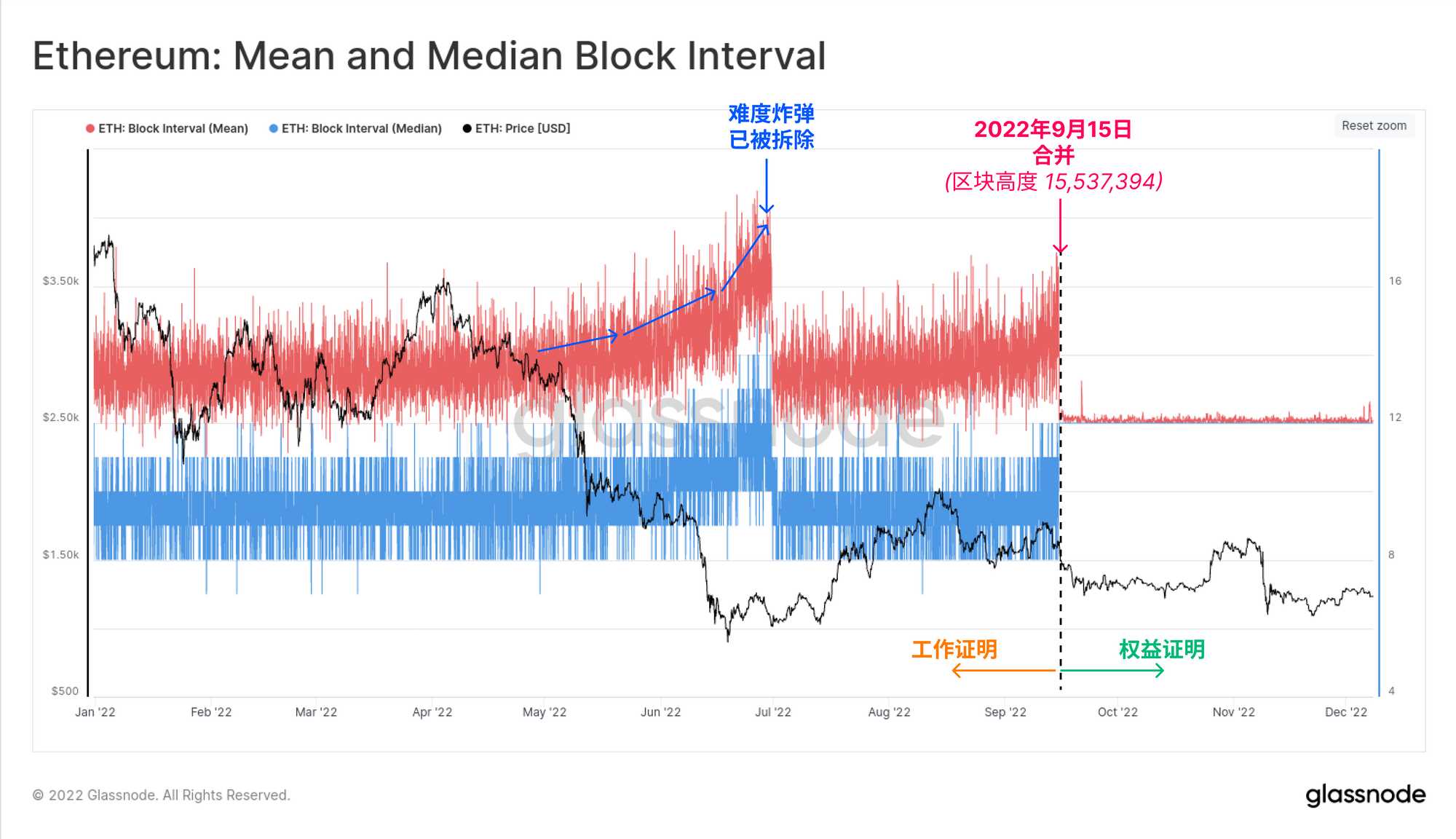 9月15日完成Ethereum合拼,算得上是在今年的最让人印象深刻工程项目创举。为了能直接地掌握这一事件的迫切性,下面的图显示2022年期内,区块链爆快间距的均值和中位值。非常明显,自然和依照概率分布函数变动的"工作单位证明”与世长辞,而精准的、预先确定的12秒区块链时间"权益证明”逐渐起效。