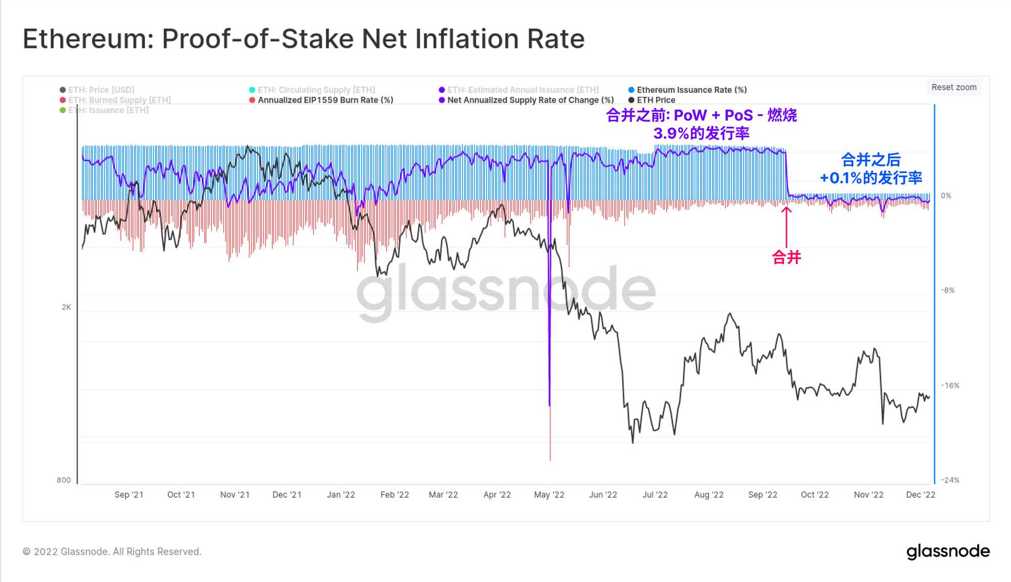 伴随向权益证明的衔接,以太坊的财政政策调节到了一个显著较低的发售时刻表。为名发售率(深蓝色)大约为 0.5%,可是在充分考虑EIP1559的点燃体制(鲜红色)后,这显然彻底被相抵,在最典型的一天中,具体发售率大约为 0.1%。相比之下,合拼前净通胀率为 3.9%,投放量的改变极大。