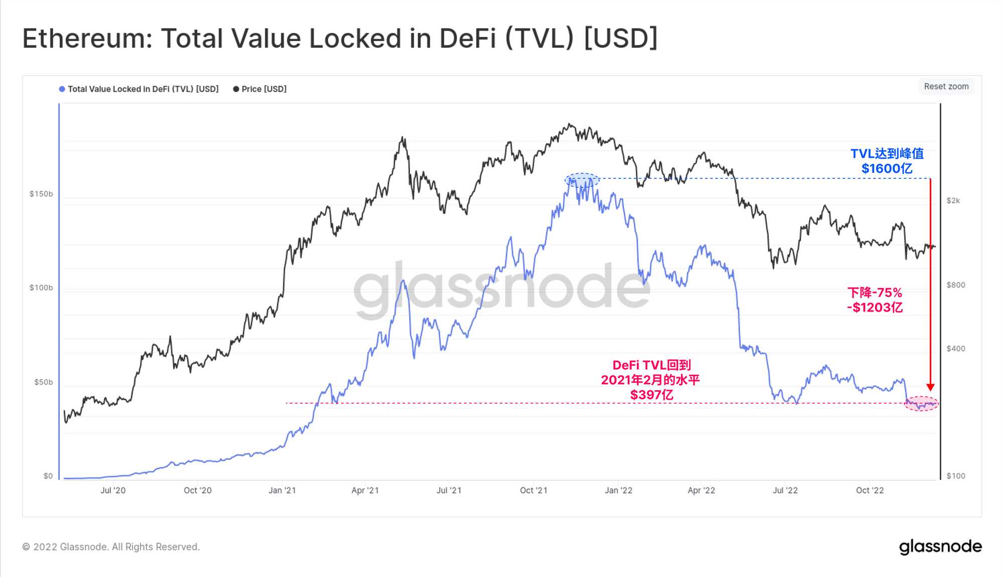 伴随着货币价钱的极其出现缩水,及其流动性比较严重收拢,锁住在DeFi的总额已大幅度下降。在2021年11月的行业做到1600亿美元最高值后,DeFi总锁单TVL早已下降超出1203亿美金(-75%)。导致DeFi抵押物使用价值下降至397亿美金,回到2021年2月的水准。