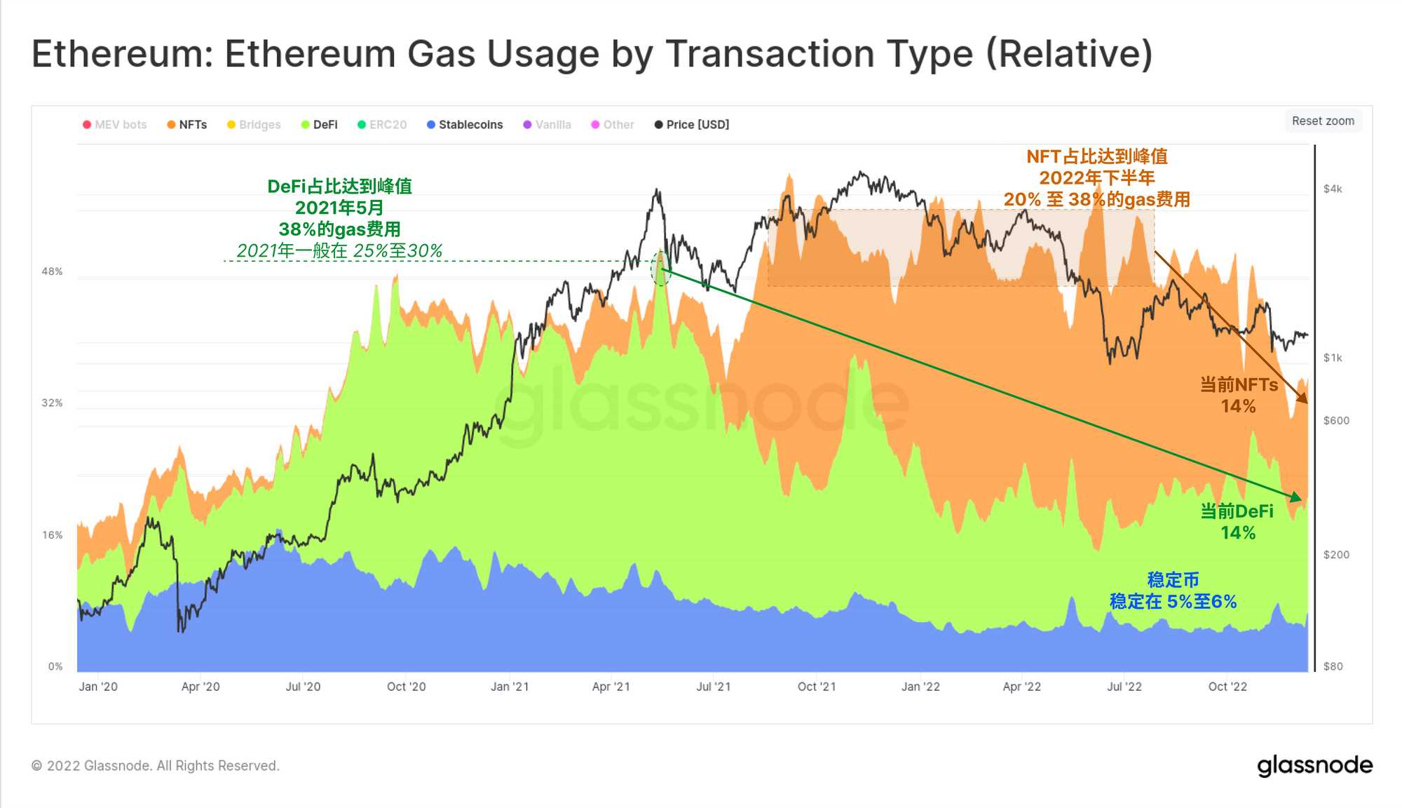 在相似的兴盛-低迷周期内,NFT有关买卖在2022年上半年度占gas fee使用量的20%至38%,但是现在也下降至14%的占有率。近年来,稳定币一直保持着5%至6%的占有率。