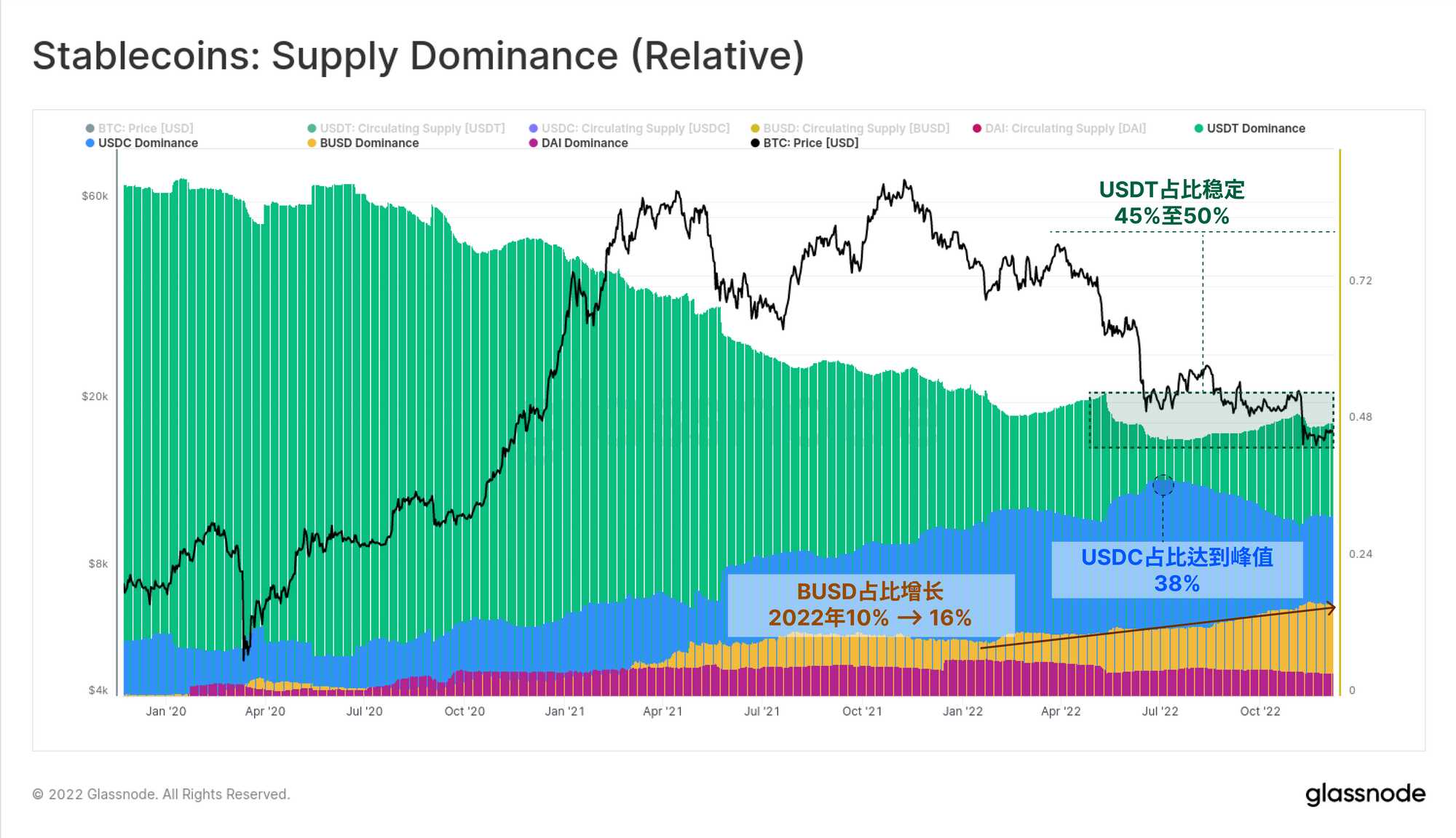 BUSD出类拔萃,其市场占有率从10%增至2022年的16%,如今等同于220亿美元资产总额使用价值。