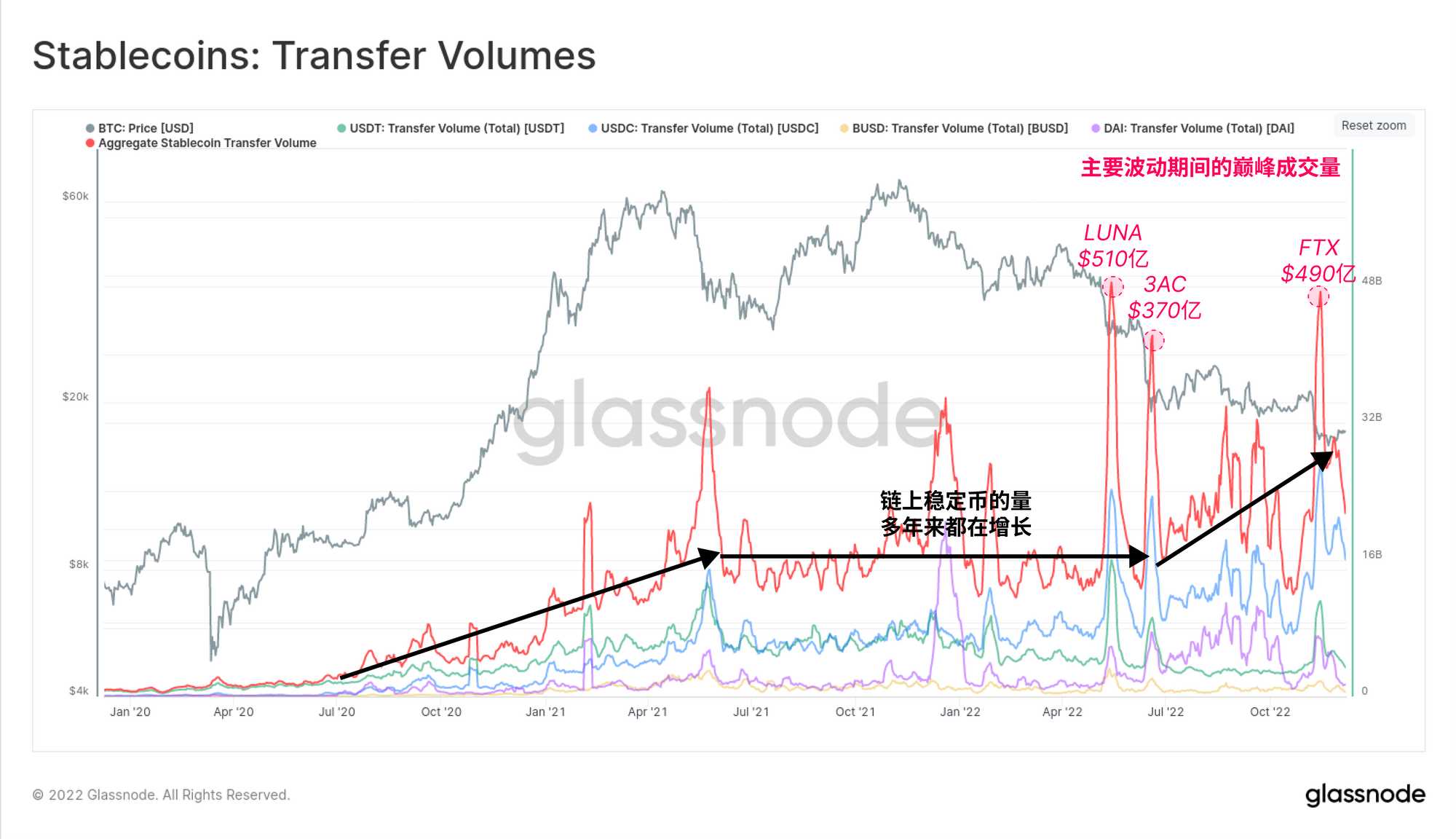 在5月、6月和11月高不确定性售卖事故中,稳定币的总体转帐量达到370亿至510亿美金间的最高值,这说明在脱虚向实事故中,投资人对美金流动性极端化要求。