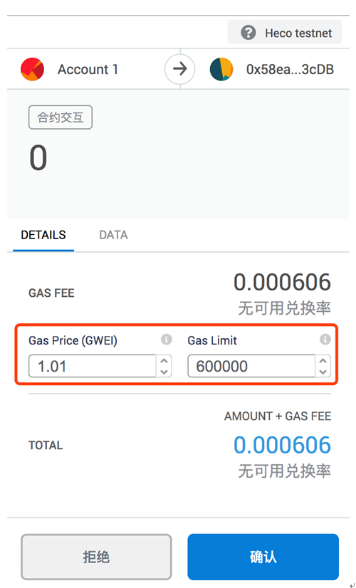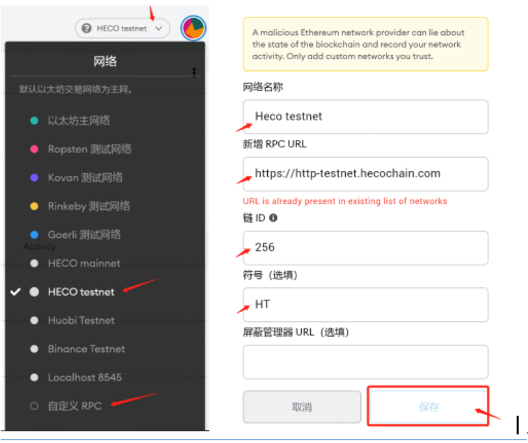 1、添加Heco testnet网络时,若参数粘贴复制,不同手机型号均需注意空格数量;