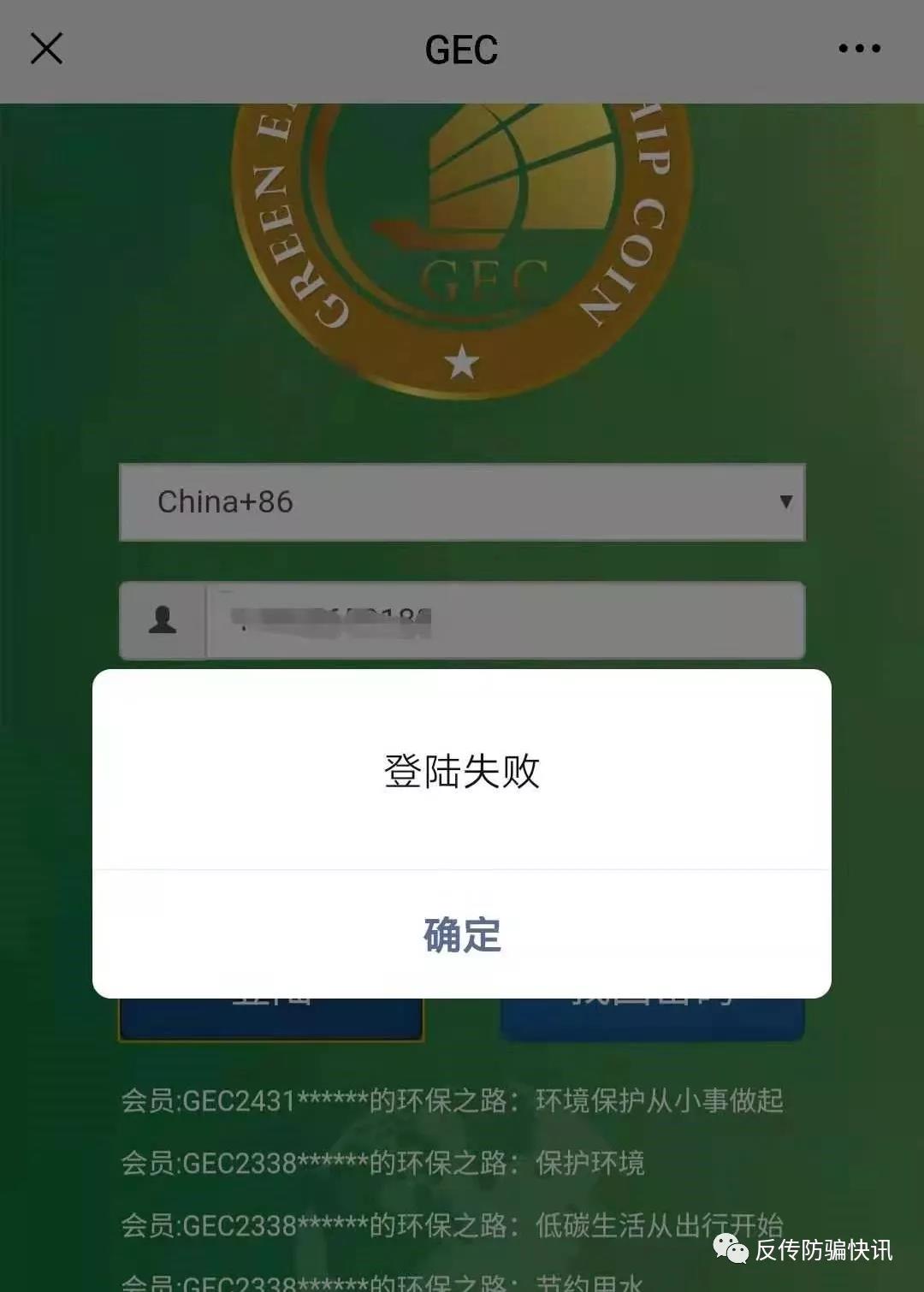反传防骗快讯获悉,4月25日上午,“GEC环保币”平台突然开始维护,所有会员账户登陆时均提示“登陆失败”。值得注意的是,4月21日,“GEC环保币”平台就可以断断续续的在维护中,大量会员无法交易。