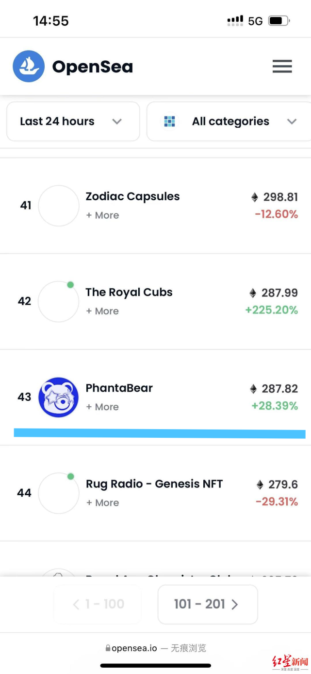 截至红星新闻记者发稿时,PhantaBear最近24小时的总排名已跌到第43位,甚至不如新加坡女网红IreneZhao发起的IreneDAONFT高。平均价也一直下跌,只有2.05ETH。