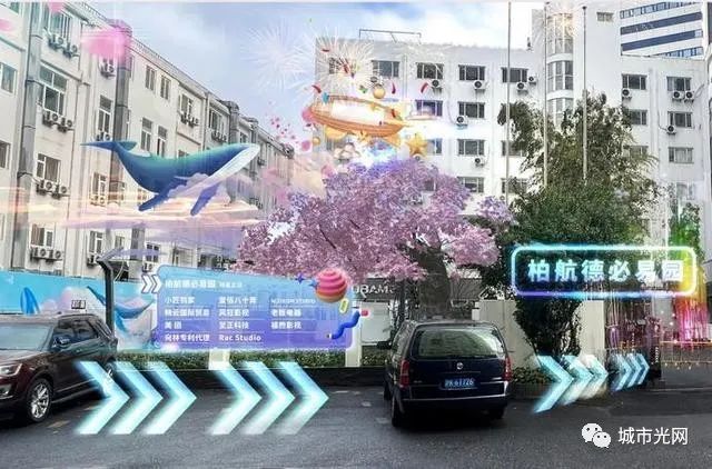在这里,戴上AR眼镜或是打开手机,展现在眼前的便是永不迷路的主视角园区导览、24小时在线的AR大屏广告,还有浮于天空的北冥巨鲲、赛博朋克风的更新“建筑”和小彩蛋等诸多沉浸式的内容体验。并充分体验没有漫长的施工周期,也没有扰人的“装修”,但颜值与功能双在线的办公环境。