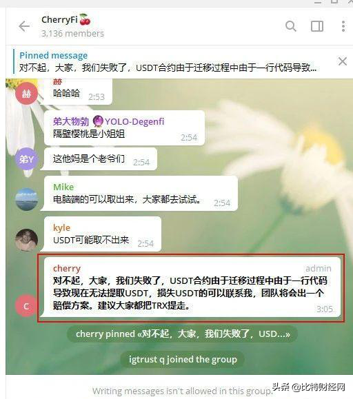 9月5日下午,CherryFi(樱桃)项目前脚刚开放挖矿,晚上就发出通知:【由于代码错误导致USDT无法提现】,并随即开始了禁言。