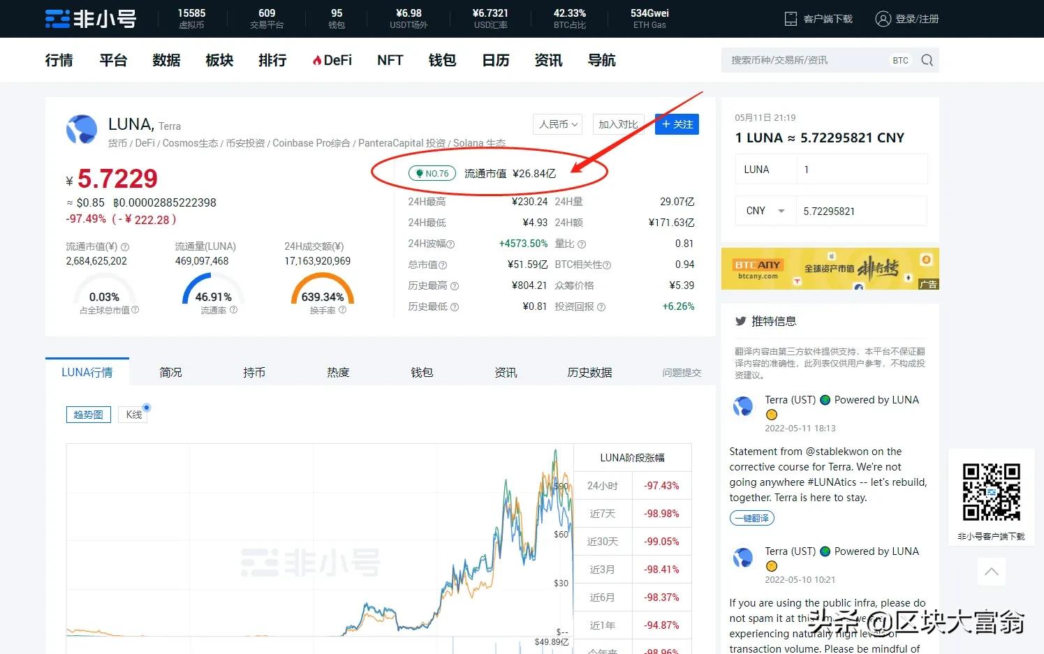 币圈露娜luna这个数字货币绝对是最近头版头条,七天时间流通市值缩水接近三千亿。也算是自币圈以来前无古币了。