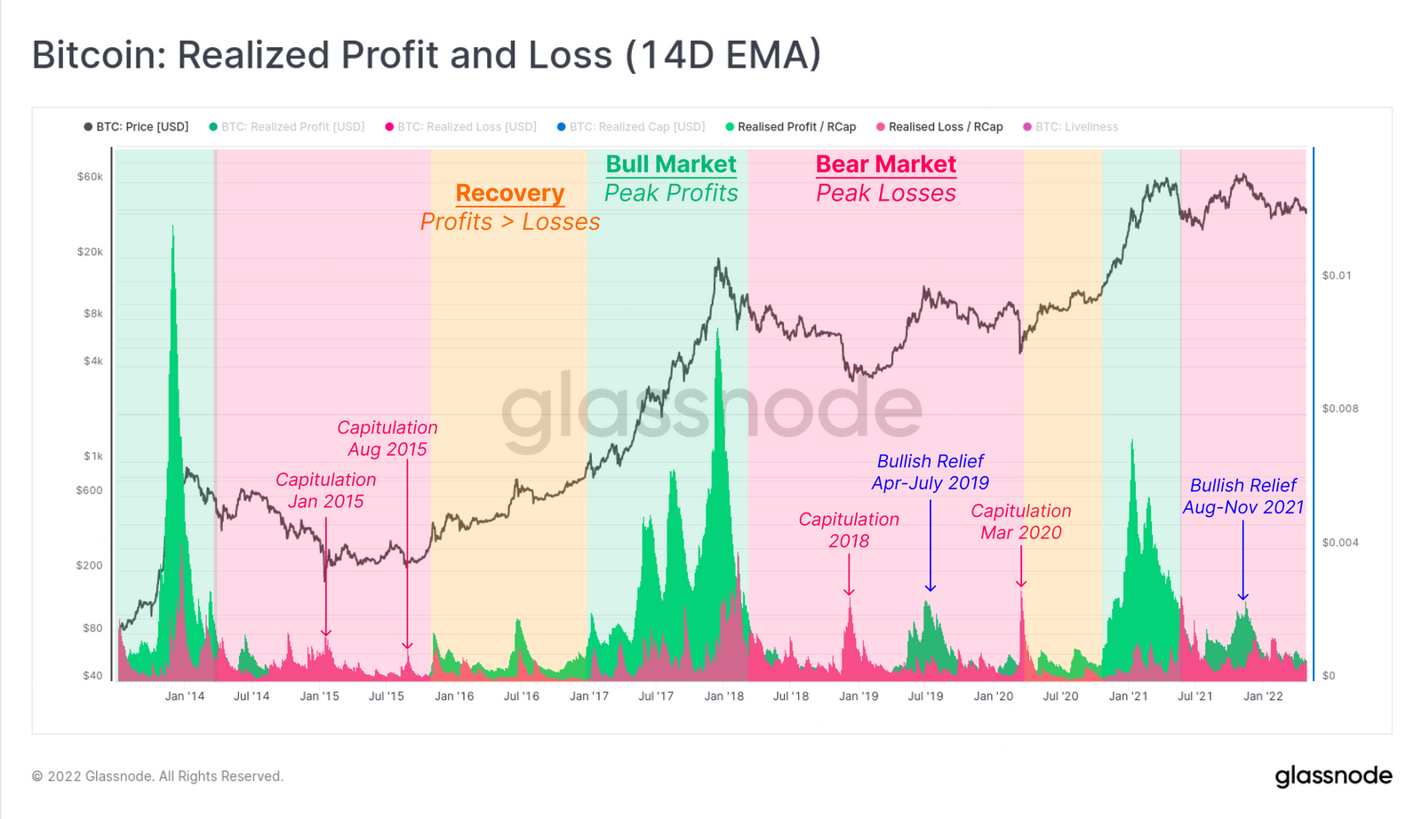 2. 熊市(红色区域),情况正好相反,价格下跌导致投资者损失处于主导地位(净资本流出)。2019年,也可以说2021年末,我们观察到短暂的看涨反弹中投资者卖出获利。
