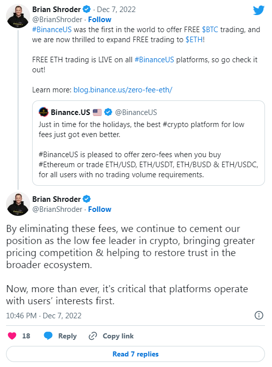根据 Binance 美国总裁兼首席执行官布赖恩施罗德的说法,取消 BTC 和 ETH 的费用巩固了该公司“作为加密货币低费用领导者”的地位。他补充说,“现在比以往任何时候都更重要的是,平台首先要以用户的利益为出发点。”