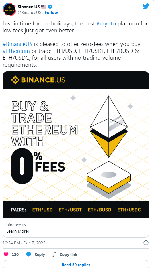 币安美国宣布已将其“零费用价格模型”扩展到以太币立即生效。