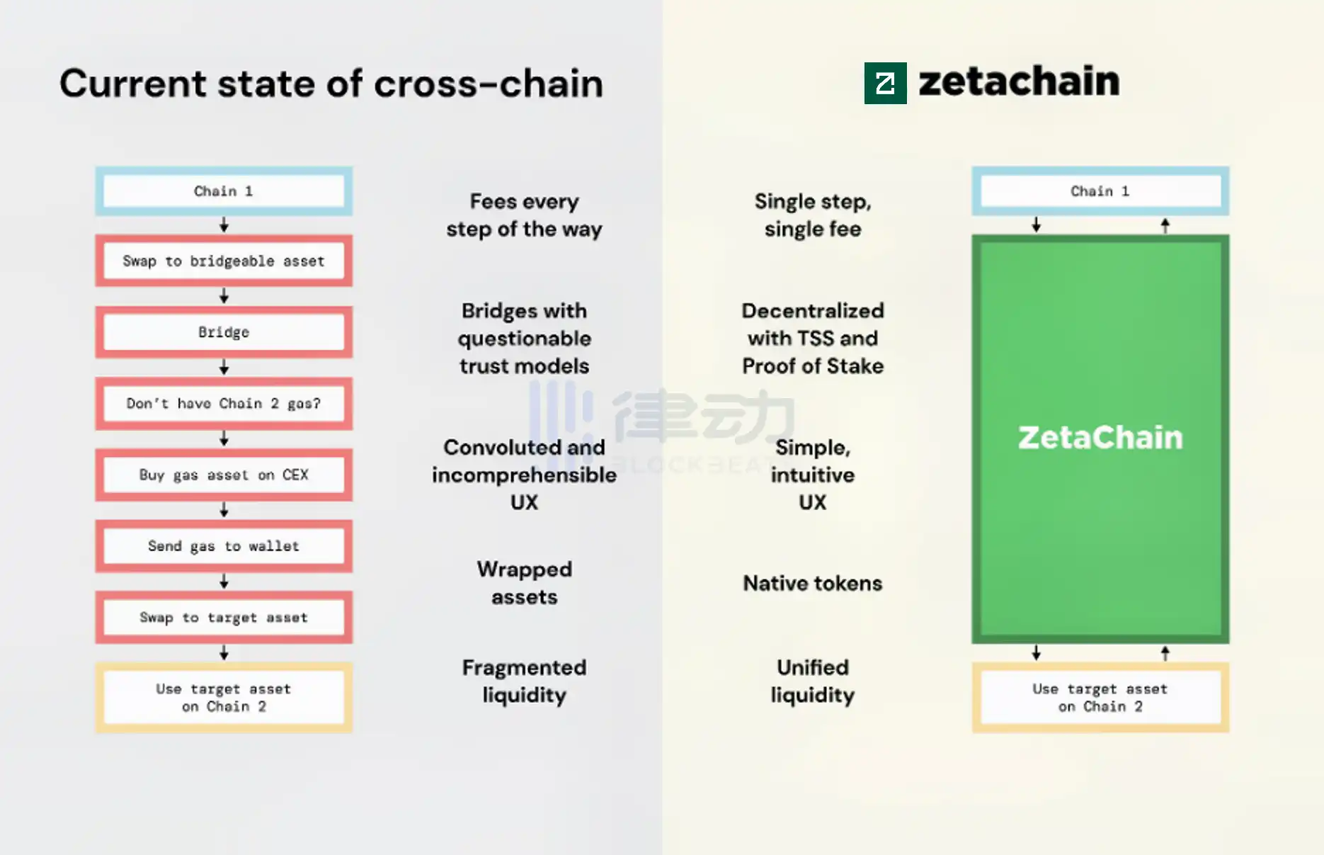 Brandon:确实,复杂度大大降低。如果你在三条链上执行交易,你必须在每条链上都广播这一交易。这样做的成本会指数级增长。如今,跨链的实现要么依赖于消息传递,要么依赖于桥接技术。你无法真正实现在多链上保持同步的状态,并在各处执行交易。但通过 ZetaChain,你可以在三条或四条链上管理资产,而所有的逻辑集中在 ZetaChain 这个中心节点上进行处理。