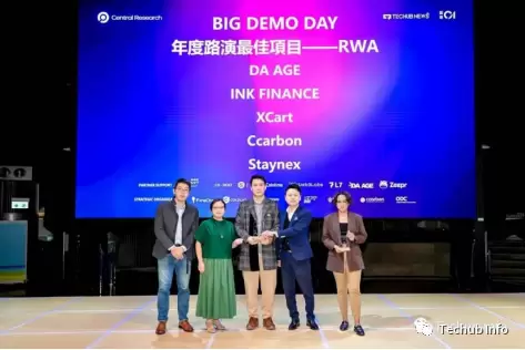 RWA 项目中,DA AGE、INK FINANCE、XCart、Ccarbon、Staynex凭借其在现实世界与虚拟世界之间的桥梁作用获得了年度路演最佳项目 RWA 奖项。