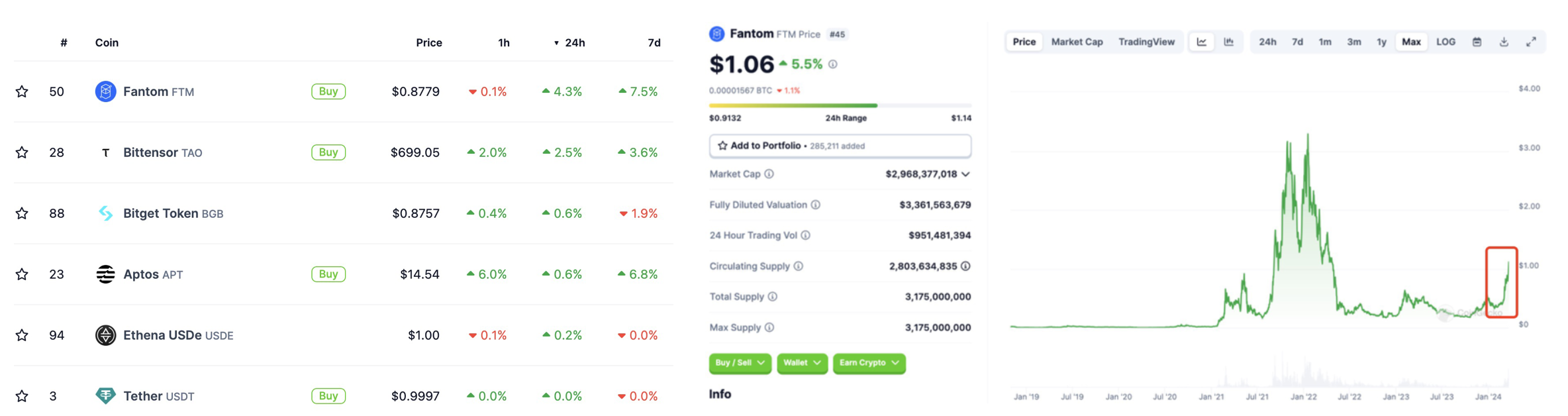 这几日,老牌公链 Fantom 引起了社区的关注。在前日比特币、以太坊回调,大盘普跌之中,Fantom 以 24 小时涨幅 4.3% 的走势稳居 Coingecko 涨幅榜第一。但实际上,这样的信号并不意外,近一个月,FTM 涨幅超 146.2%。